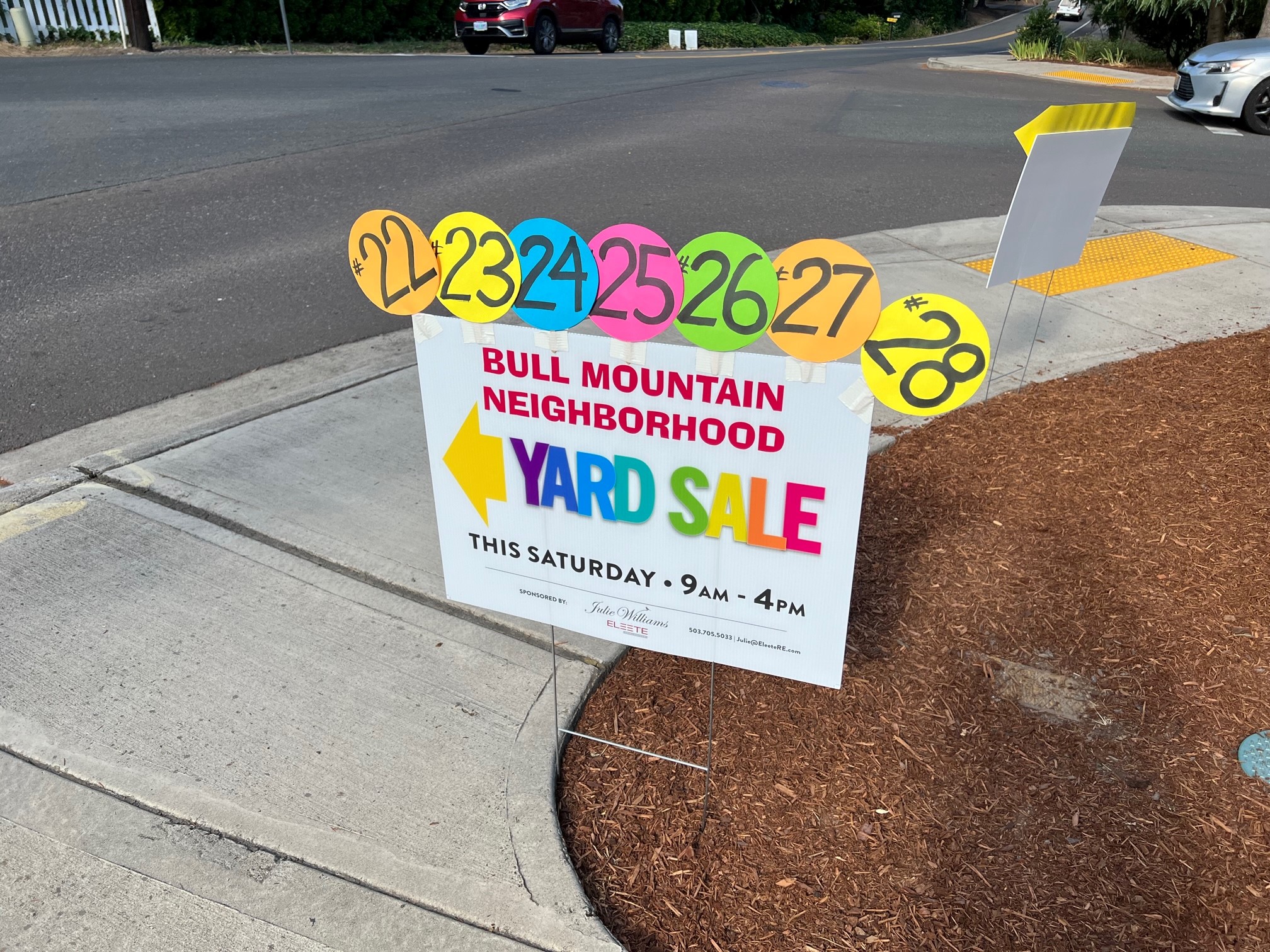 Save the Date! The last Saturday of July is typically the date for the Bull Mountain Yard Sale. It is completely free to participate and sponsored by Julie Williams. We take care of everything...advertising, online ads, signs, maps, and goodie bags for all participants at no cost to you! Last year we had over 40 homes participate and plenty of shoppers showed up to bargain hunt. Contact Julie at 503.705.5033 or Julie@EleeteRE.com for additional info.